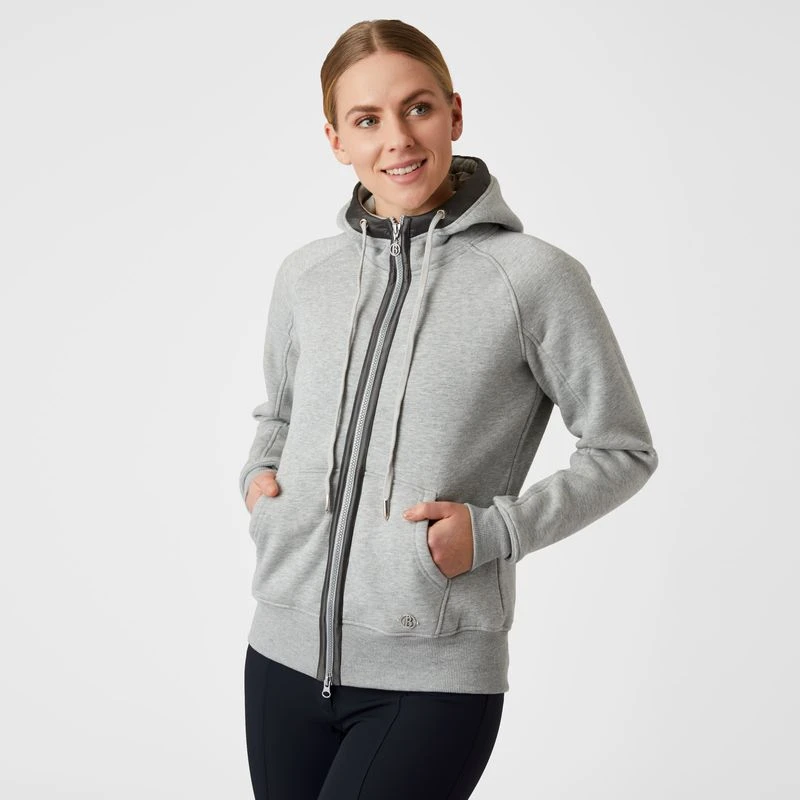 The B Vertigo Gianna Zipper Hoodie is super comfortable for riding. Soft, elastic material with brushed inside keeps you warm when you need it, and is easy to throw on over your favorite shirt. The adjustable hood and ribbed cuffs add extra warmth and keep the wind away. Shiny fabric around hood and zipper is an eye-catching detail. The big back print looks cool and adds sporty vibes. Pair this hoodie with your favorite breeches, riding tights or jeans.