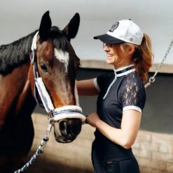 The B Vertigo Lauren show shirt is made from soft, breathable piqu fabric that feels cooling on the skin. The collar is decorated with a satin band, and closes with press buttons. Gorgeous lace sleeves add an elegant feature to this pretty show shirt. Pair it with your favorite white breeches, and nothing will stop you.