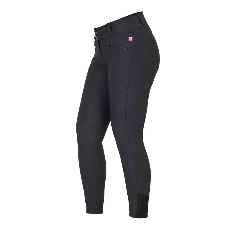 The design around the hip section provides the best possible fit helping to minimize rider fatigue and adding to comfort in the saddle. The waist is elastic with a medium waistband that follows the contour of the lumbar spine for extra support where it is needed most. The side seam on the outside of the leg is positioned to relieve pressure on the kneecap. Mesh stretch panels provide a secure fit around the calf and ankle. The knee patch has an innovative and durable grip system. The pockets are a thin breathable material: a flexible mobile phone pocket and two front pockets with zippers.