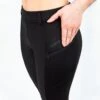 The design around the hip section provides the best possible fit helping to minimize rider fatigue and adding to comfort in the saddle. The waist is elastic with a medium waistband that follows the contour of the lumbar spine for extra support where it is needed most. The side seam on the outside of the leg is positioned to relieve pressure on the kneecap. Mesh stretch panels provide a secure fit around the calf and ankle. The knee patch has an innovative and durable grip system. The pockets are a thin breathable material: a flexible mobile phone pocket and two front pockets with zippers.