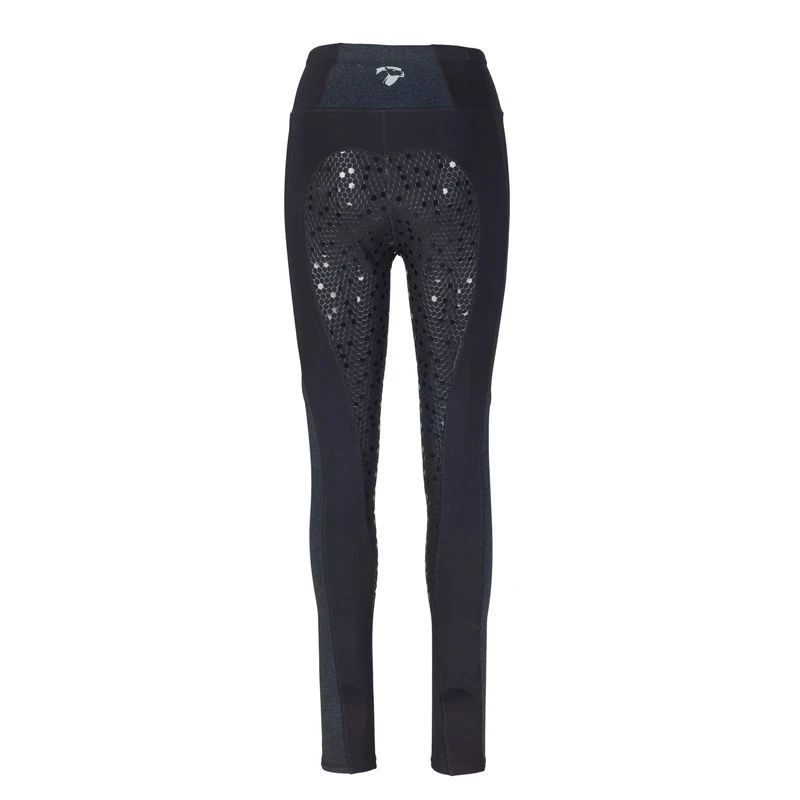 High rise pull on performance tight with silicone honeycomb full seat. Features reflective logo on left thigh and cell phone pocket on right thigh. Contrast fabric on lower leg for a trendy look.