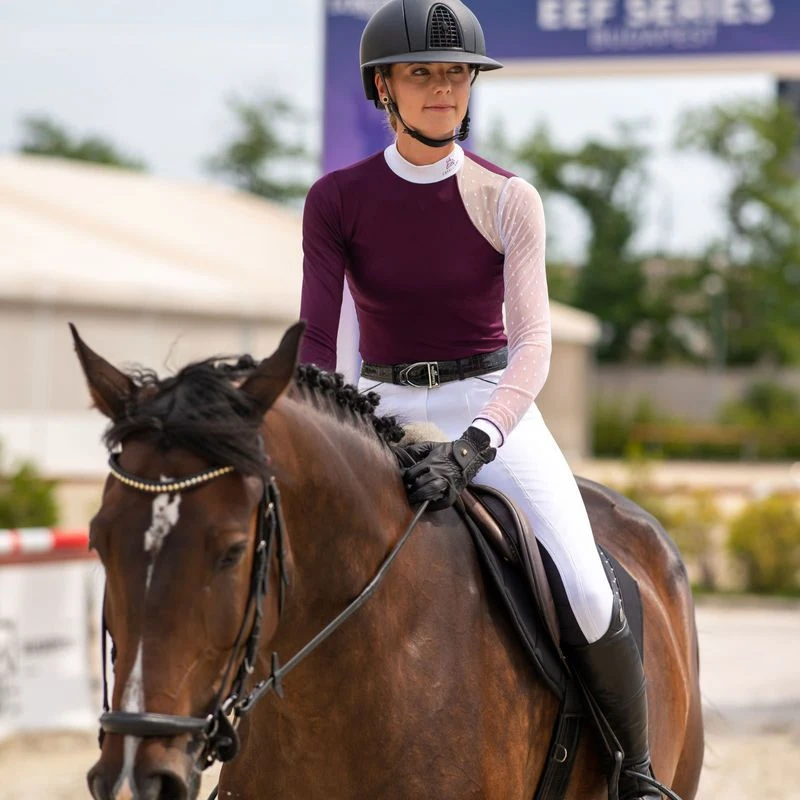 The one-sided raglan-style sleeve, contrasted color piping and branding unites elegance and technology. Built with superior performance materials, wear it for competition. It features a timeless design and athletic functionality which appeals to riders of any discipline. Wear this extra feminine equestrian show shirt and be a true Dame.