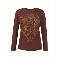 Swirls of mane and tail celebrate the free spirit of horses and the women who love them in this piece of wearable art by Tricia Scheelestriking on its own or as a layer.