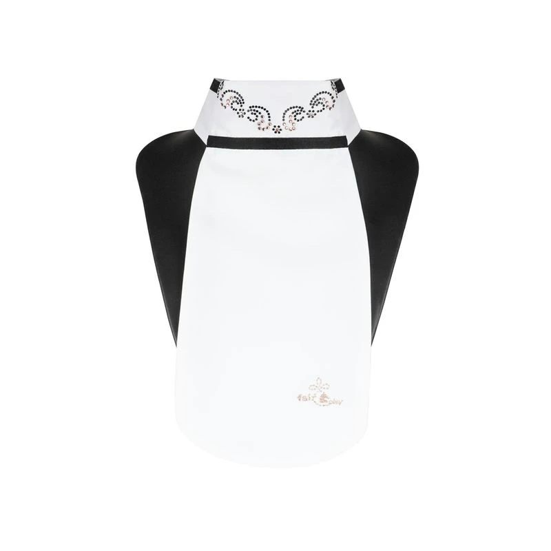 This Lea is made of taffeta with an elegant scroll of rose gold jets at the collar. It is pre-tied with a touch and close fastener at the back.