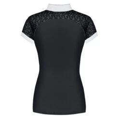 This feminine, sporty show shirt is made of a stretchy recycled technical fabric that is breathable and moisture wicking. It has stretch lace inserts on the shoulders that add both comfort and style to the shirt. The tab collar is fastened with decorative buttons on a front placket, and is decorated with shimmering piping. There is a Fair Play logo with crystals.