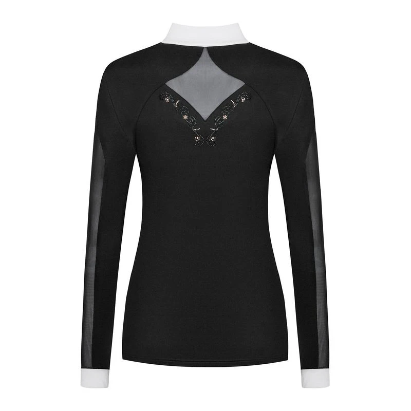 The Cathrine is made of stretchy and breathable tech fabric. There are elastic mesh inserts on the front and sleeves that add interest and extra breathability. It has decorative placket buttons and discreet crystal applications.