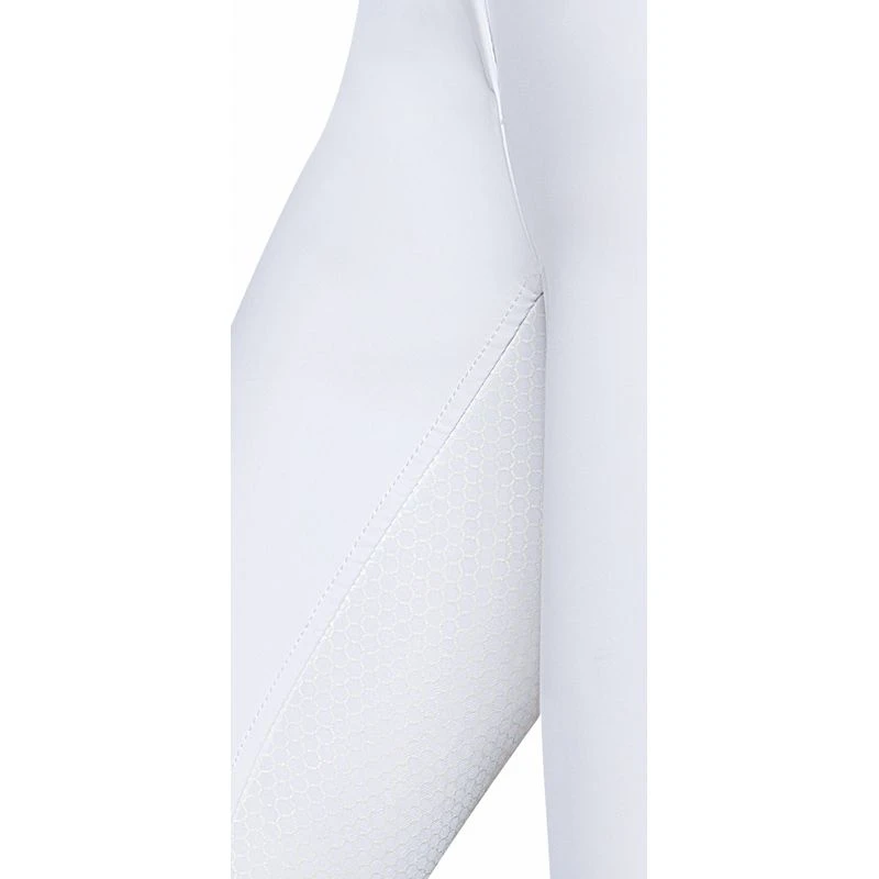 These high rise, front zip breeches feature pockets decorated with a discrete scrolling crystal application. Just enough to look formal without looking gimicky! They have a full seat with comfistick grip technology to keep you firmly in the saddle, and elastic bottoms for comfort in your tall boots.