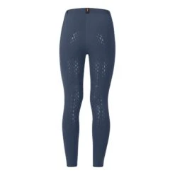 This breech features a wide double closure waistband and slash pockets. The pockets have decorative jewelry tape. The full seat is made with comfistick technology grip and the leg bottoms ar elastic.