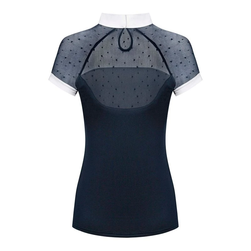 This simple, yet elegant show shirt features a stretch dotted mesh insert that give a lace look and excellent breathability. The stretch tab collar is perfect alone in the jumper arena or add a stock tie for dressage. The balance of the shirt is made of a soft, stretch technical fabric that is super comfortable and moisture wicking.