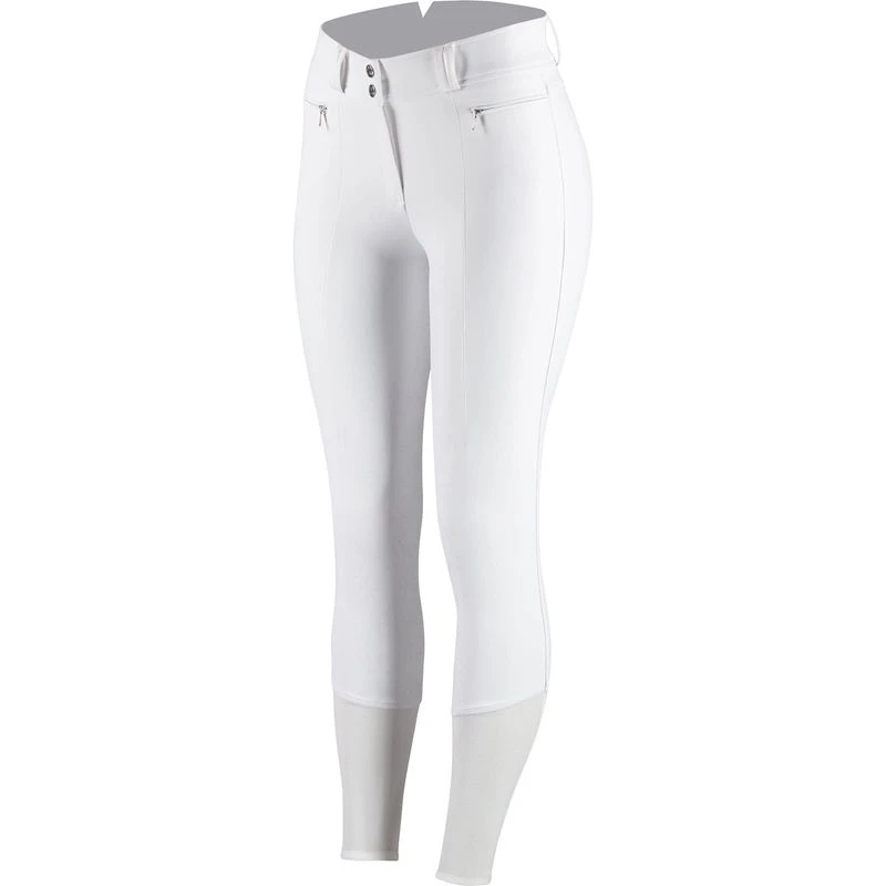 The Horze Women’s Angelina Full Seat Breeches with Silicone Grip are lightweight full seat breeches that are the perfect choice for hot summer days. These riding pants are designed with seams at the front for a slimming effect. A silicone print full seat provides extra grip and security in the saddle. The high waist helps you maintain your correct position with ease. Additional details include convenient front zipper pockets, along with a front zipper and snaps. The Angelina Full Seat Breeches by Horze are made from breathable and quick dry fabric to keep you cool and dry. The mesh fabric at the leg is also breathable to help you stay comfortable under your boots.