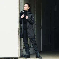 A drawstring hood keeps moisture away and helps you stay warm and dry when you wear this classic raincoat. The Horze Billie Rain Jacket is designed to protect you from the elements with adjustable cuffs, a 2-way zipper and press button front. The big pockets hold keys, treats and other treasures so you can wear this jacket around the stable or on horseback. The reflective print on the sleeve ads a touch of visibility on dark, dreary days.
