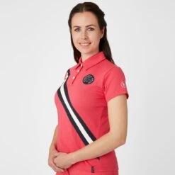 The Horze Jessie t-shirt is made from breathable material that is perfect for your daily rides. The sporty design with collar and contrasting stripe easily matches your riding wardrobe. Press buttons at the placket provide additional ventilation when needed. The embroidery on the chest looks timeless and chic. Wear this jersey shirt riding, in the stables or in your free time. It can easily be combined with breeches, tights or jeans.
