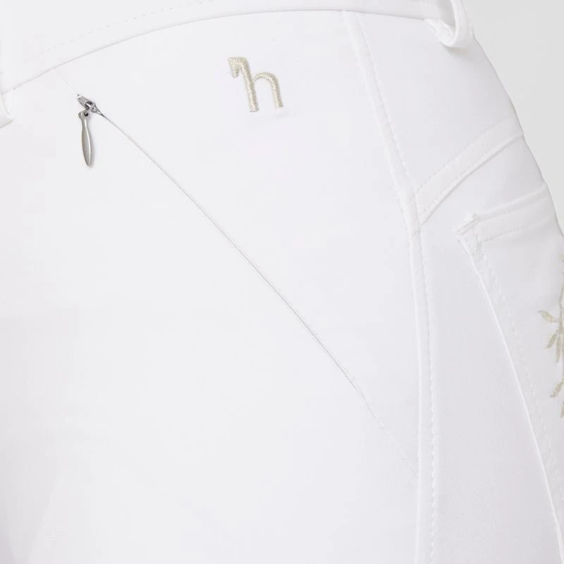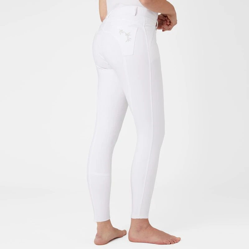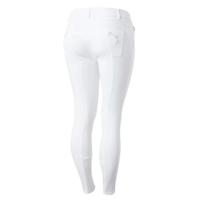Made from soft, stretchy material. Front pockets with zippers keep your phone safe and embroidered back pockets with silver leaves match the floral silicone full seat. Muted colors fit your riding wardrobe perfectly.