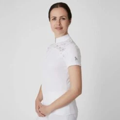 Designed with short sleeves to keep you cool in summer. The silver flower print adds lovely detail at the shoulders. Adjust the collar with a zipper for a perfect fit. Combine this shirt with the Horze Katilin Breeches for a stunning outfit. 100% micro-polyester.