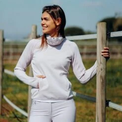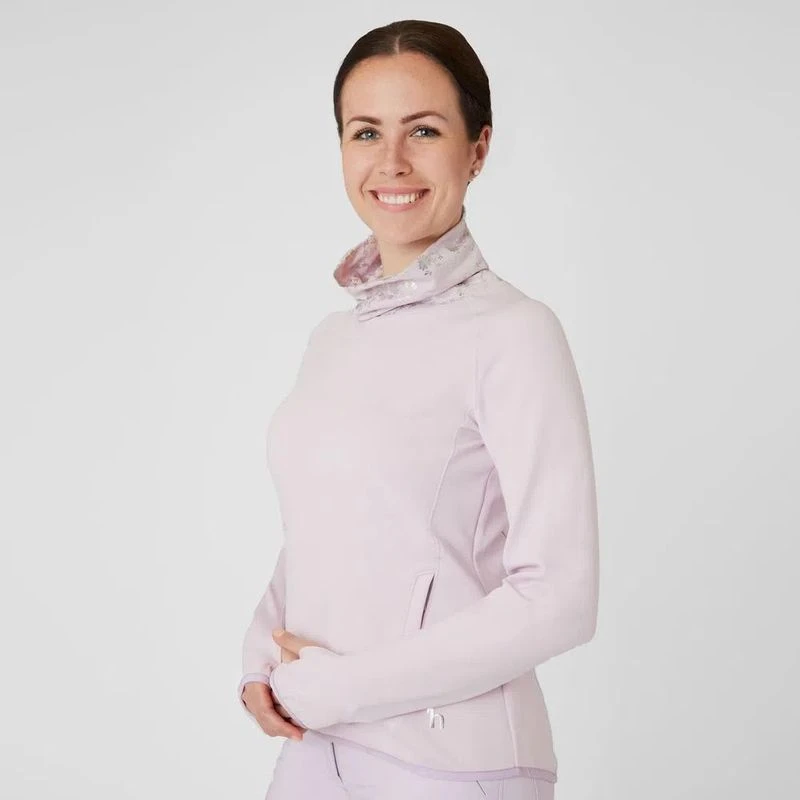 Features include breathable technical fabric with two zipper pockets to keep your hands warm and your belongings safe. The flower pattern on the collar adds lovely detail. Combine this tech top with the Horze Kaitlin Breeches for a full outfit.