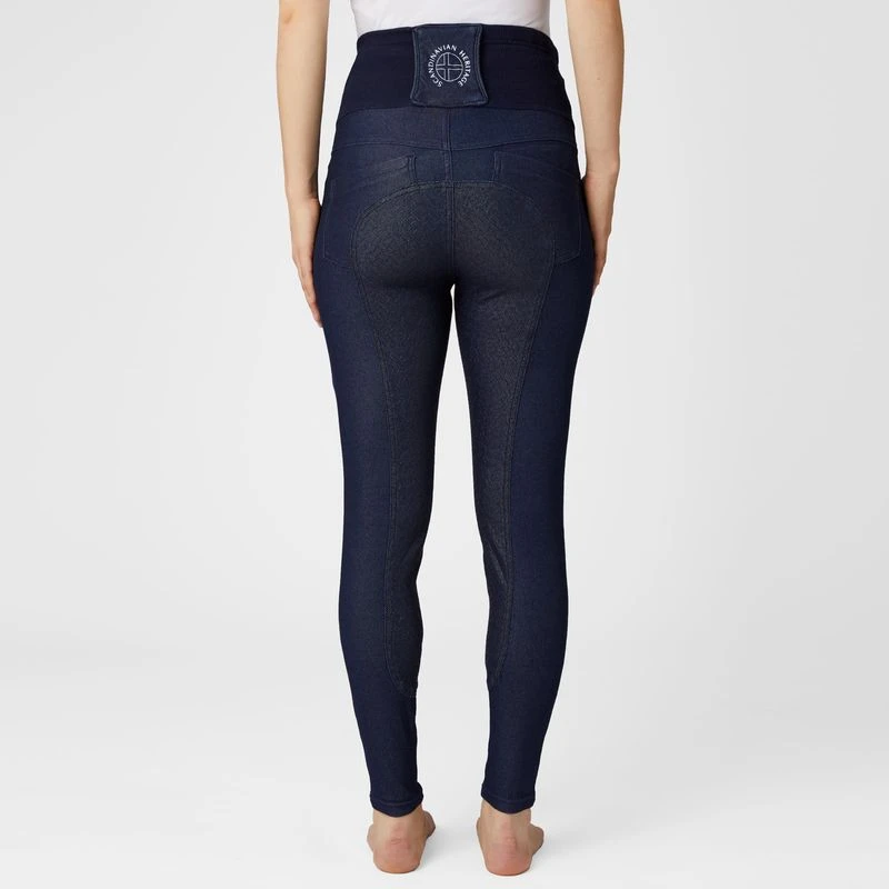 You want the qualities of breeches and the look of jeans? Choose the Horze Katia denim riding tights for all of this plus additional comfort. Super light, elastic fabric feels great in your daily training, and breathability prevents overheating in summer. The high waist with elastic, adjustable cotton band is super comfortable for your bump, and keeps these tights in place. Cool jeans design and contrasting piping along the pockets and back looks super cool, and makes a perfect addition to your riding wardrobe.