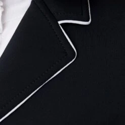 The Horze Martina Show Jacket is the perfect addition to your show turnout. Soft, breathable fabric is elastic to adapt to your movements. The tapered fit flatters your figure. White piping on the lapel adds an eye-catching detail. Front pockets and silver buttons complete the elegant look. Pair this jacket with your favorite show shirt and breeches.