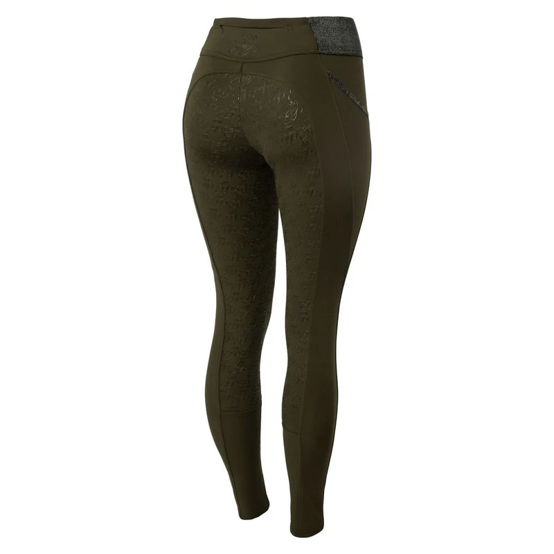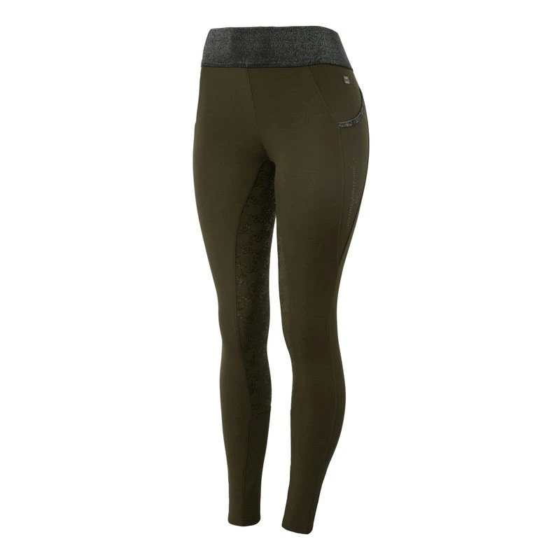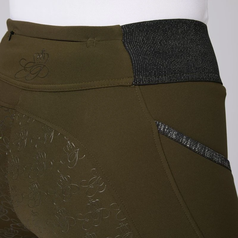 These full seat riding tights are equipped with everything you need to stay comfortable while riding: An elastic waist on breathable material with a silicone full seat. Front pockets and a zip mobile pocket in the back keep your belongings safe. A monogram print brings a touch of luxury to these affordable leggings.