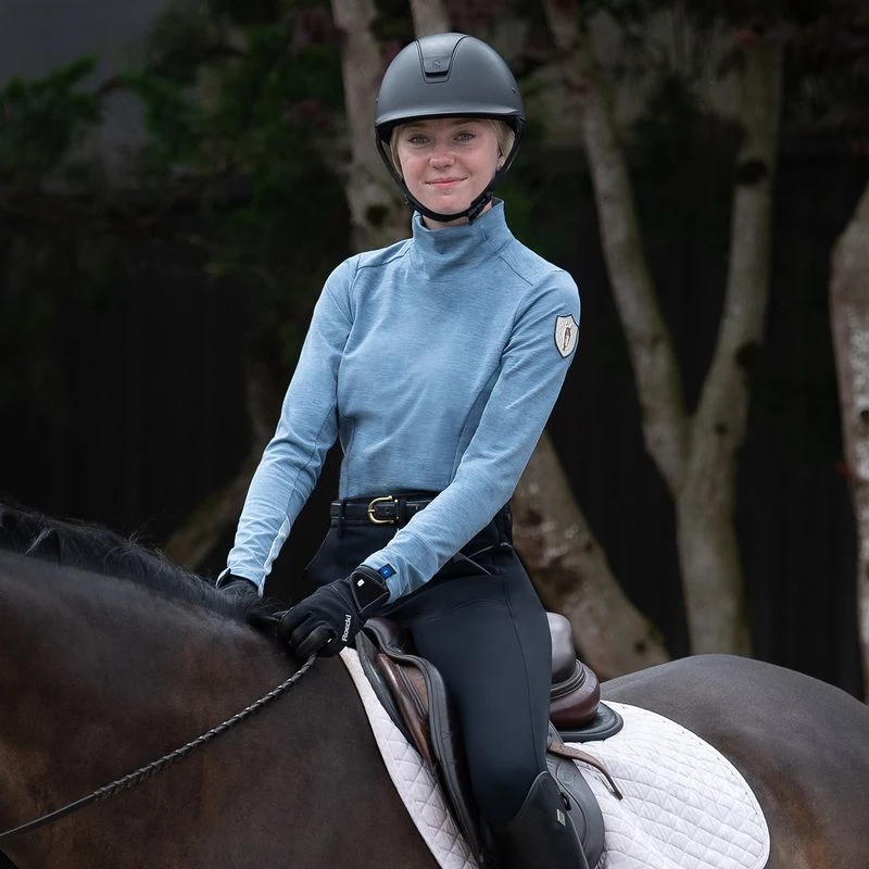 The Radiant Mock Neck offers a slim-fit pullover style that makes layering easy. It features a high mock neck collar, soft sleeve cuffs with thumbholes that keep the cold air out, and a rose gold horsehead crest on the sleeve that adds a bit of bling. You wont be disappointed with this piece!