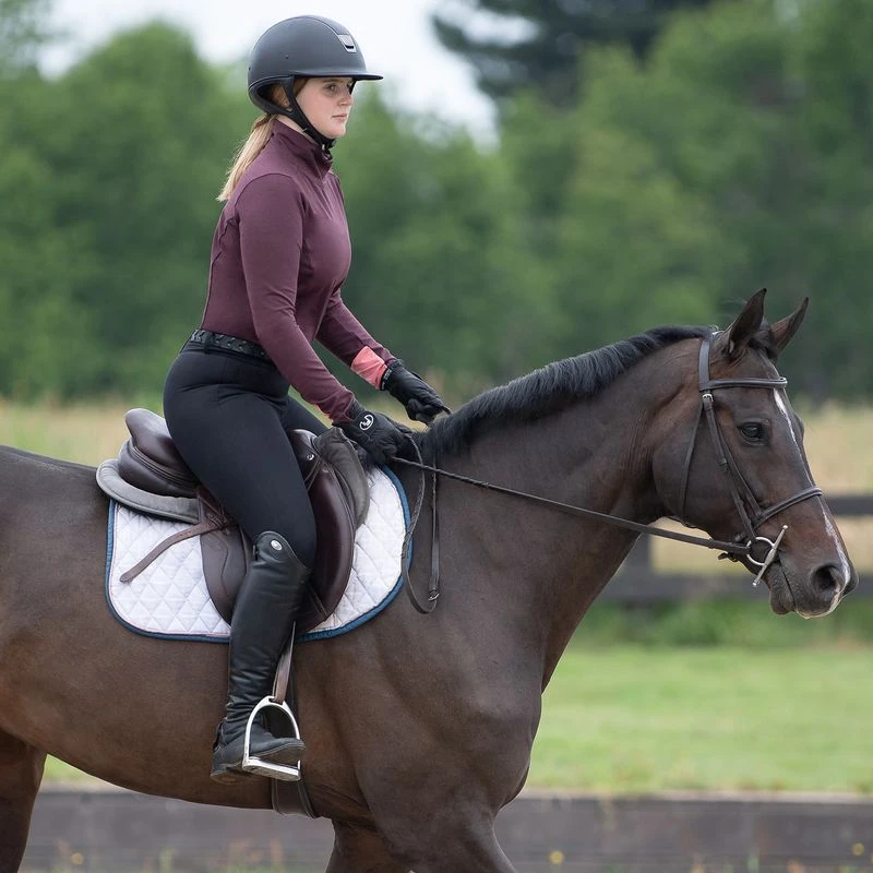The Radiant Mock Neck offers a slim-fit pullover style that makes layering easy. It features a high mock neck collar, soft sleeve cuffs with thumbholes that keep the cold air out, and a rose gold horsehead crest on the sleeve that adds a bit of bling. You wont be disappointed with this piece!