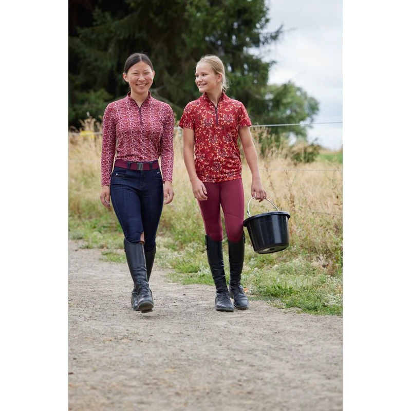 Cutting-edge Ice Fil technology wicks and cools while providing UPF+50 sun protection. Strategically distributed Anti-Slip Kerrit Sticks along the inner leg and seat grip, breathe, and stretch for added confidence. Handy side pockets for lip stuff and horse treats.