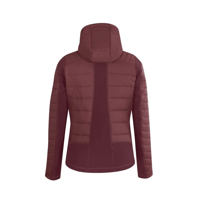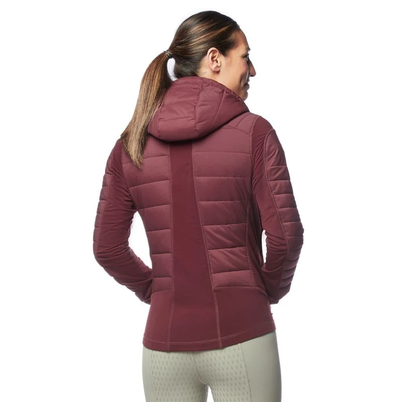 Ergonomically shaped stretch fleece panels are key to unrestricted movement and flattering fit. Hybrid jacket design combines lightweight quilted insulation with stretch-fleece providing maximum mobility with high warmth-to-weight qualities. 140-gram poly-loft fill keeps core warm. Wind and weather resistant with fully quilted hood to pull on after the helmet comes off. Two-way front zipper with tall collar, generous interior pockets and two exterior zip pockets. Sporty back stripe and embroidered horse on shoulders. Riders cut hem is shorter in the front and longer at the back for in-saddle performance.