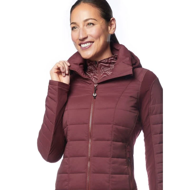 - Hybrid jacket design combines lightweight quilted insulation with stretch-fleece