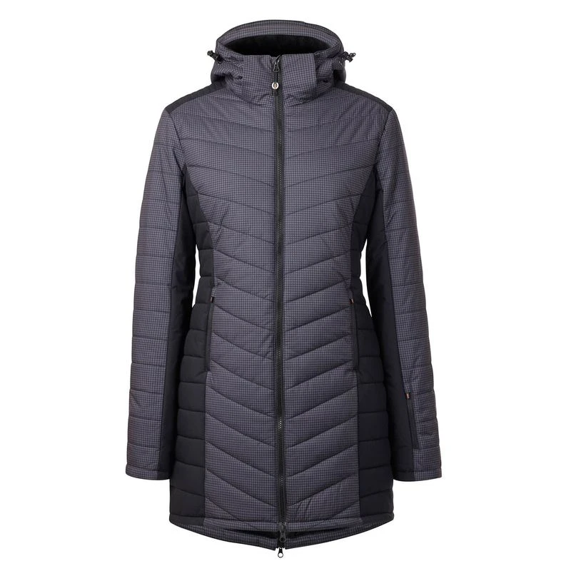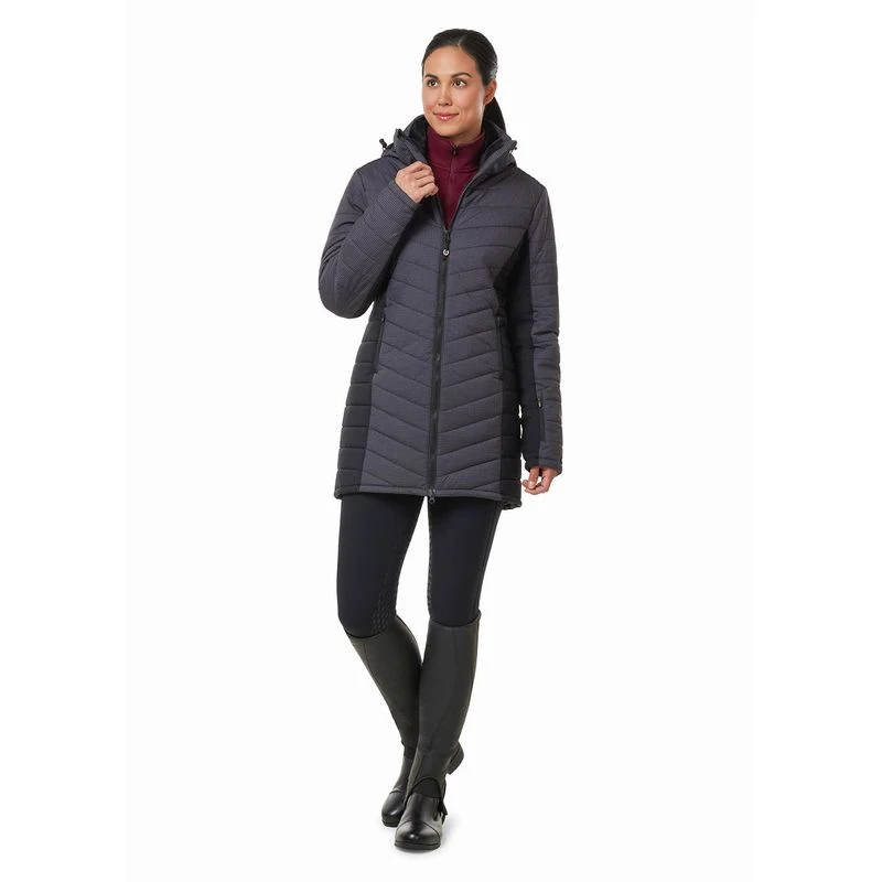 Updated with stylish mini houndstooth, the strategic design and a quilted chevron pattern combine for a slimmer, more functional silhouette. Wind and water-resistant exterior protects the 200-gram poly-loft insulation in a mid-thigh length, with back pleat that zips open for in-saddle performance. The insulated hood, cozy plush interior collar, and inner storm cuffs provide extra protection from driving winds.