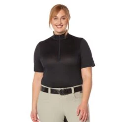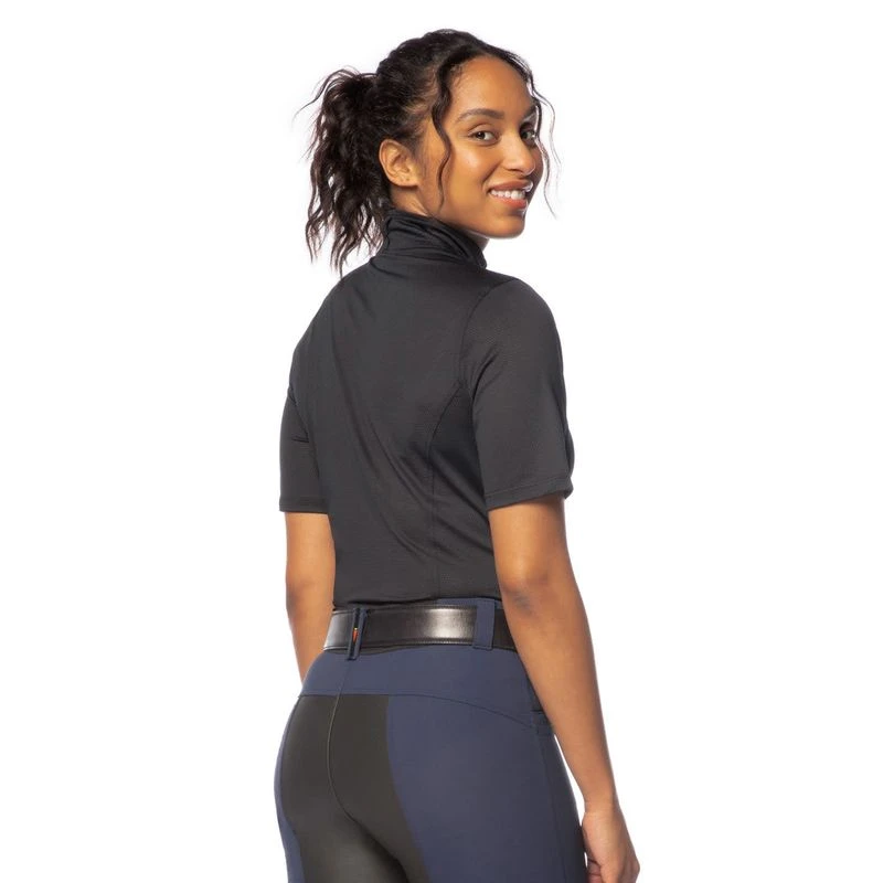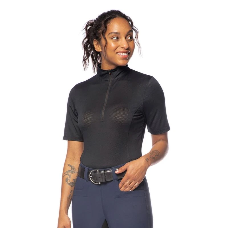 The sporty, feminine fit, and equestrian hem flatter for everyday wear, while the stock tie loop and stand-up collar add sophistication for the showring. Longer ten-inch sleeve length for added sun protection. Minimal seaming makes this shirt ideal for logo customization.