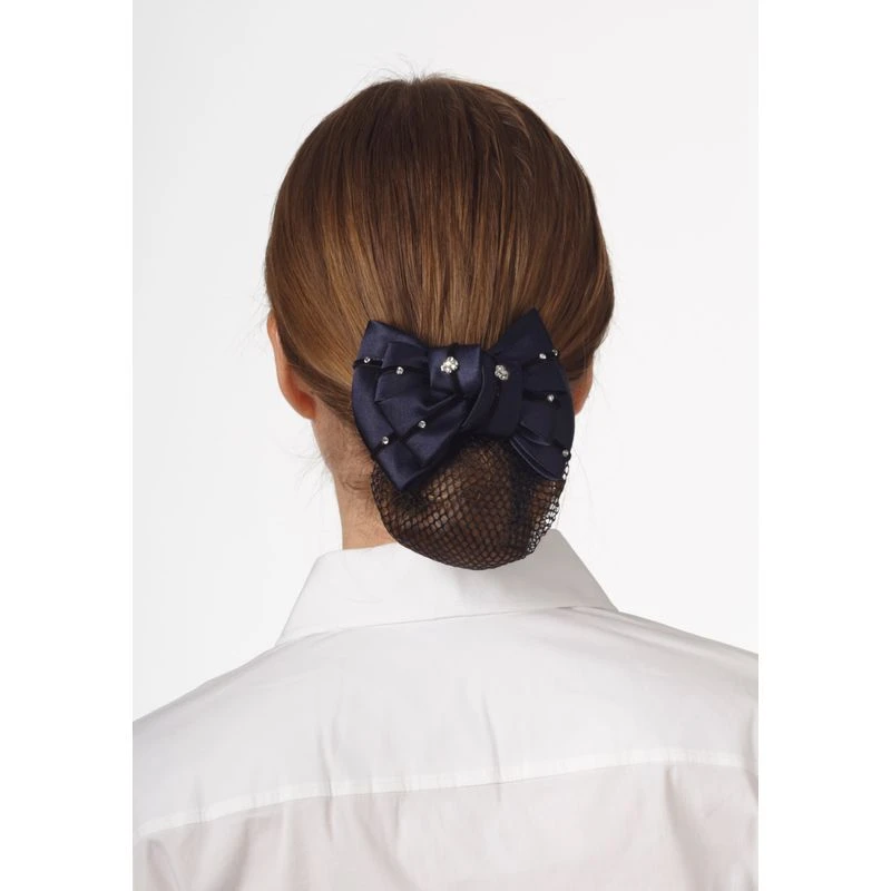 Satin and velvet textured bow features a strong hair clip and net pouch to keep hair tidy under a helmet or riding hat.