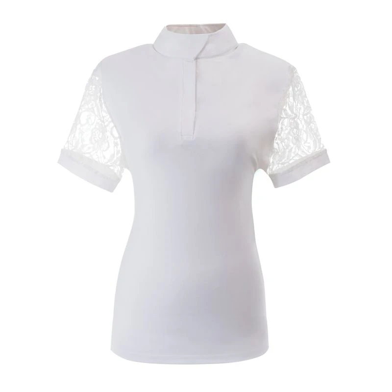 Exquisite lace sleeve and back add a feminine touch. Performance stretch fabric combined with quick dry moisture management keeps you dry and comfortable and looking your best.