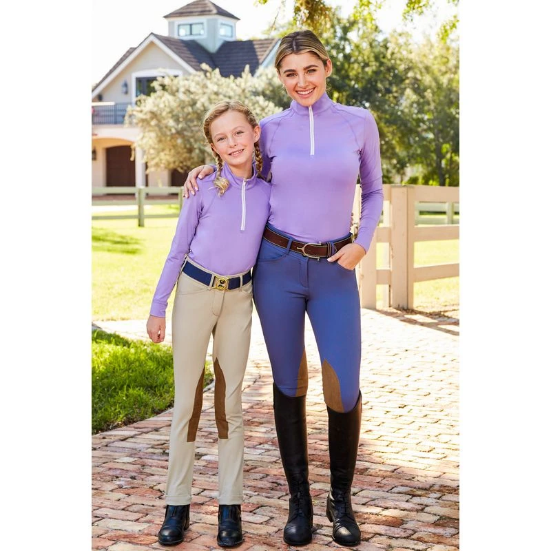 These show quality breeches feature a premium quick dry and stretch fabric, which provides amazing hand-feel, sculpt and coverage. The fabric covered interior waistband and mesh lower leg panels provide ideal comfort. Premium Clarino_ knee patches are naturally supple and breathable while presenting the elegant look of real suede, yet it can withstand intense abrasion. R.J. details on the front closures and pocket complete the design.