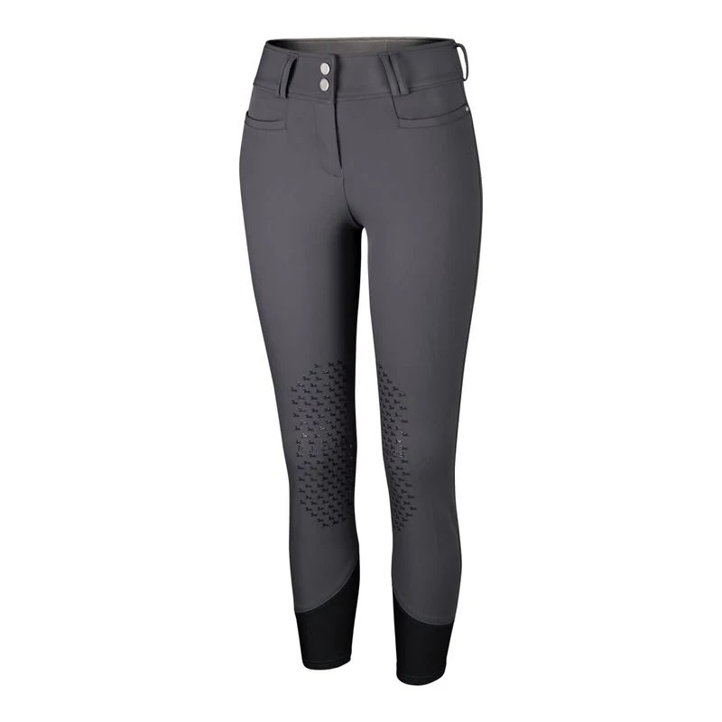 The natural rise, front zip euro seat breech features silicone knee patches for ultimate comfort and performance. The premium quick dry and stretch fabric provides amazing hand-feel, sculpt and coverage. The fabric covered interior waistband and mesh lower leg panels provide a clean and comfortable fit. Updated pocket design and logo rivets complete the design.