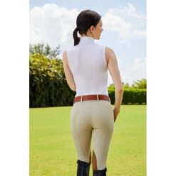 This sleeveless show shirt is so full of summer vibes! The fabric is cool and light, with enough stretch that you won’t feel it over a big jump. The judge won’t be able to tell it’s sleeveless under your show coat, but you sure will! Even the fabric says “summer” with a cool aqua shade and fun pink flamingos.