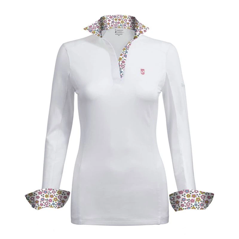 Tredsteps Cool Touch nylon pique fabric has a wonderfully cool feel on your skin while also protecting you from harmful rays and unpleasant odors. Featuring Birds Eye Mesh under sleeves, crisp cotton wrap collars and cuffs, stylish snap buttons and a choice of three trim color print options this is altogether a wonderful show shirt which you can wear with confidence in the or out of the show ring.