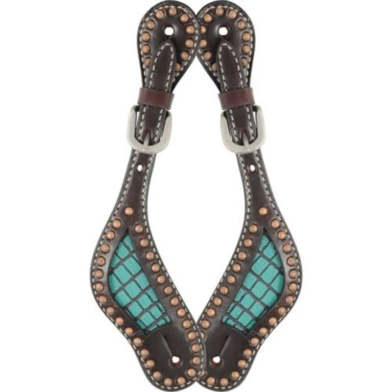 These Western spur straps feature spot accents, contrast stitching and a vibrant turquoise faux gator cut-out. Made with resilient premium quality USA tanned leather, these ladies spur straps are made to last.